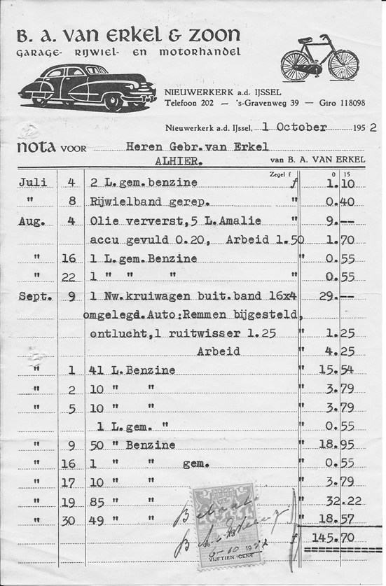 – Net voor de huizen op de ansichtkaart aan de andere kant van de weg was de Garage/Fietshandel/Benzinepomp van van Erkel, de oude baas Bart heeft mij bandenplakken geleerd. –