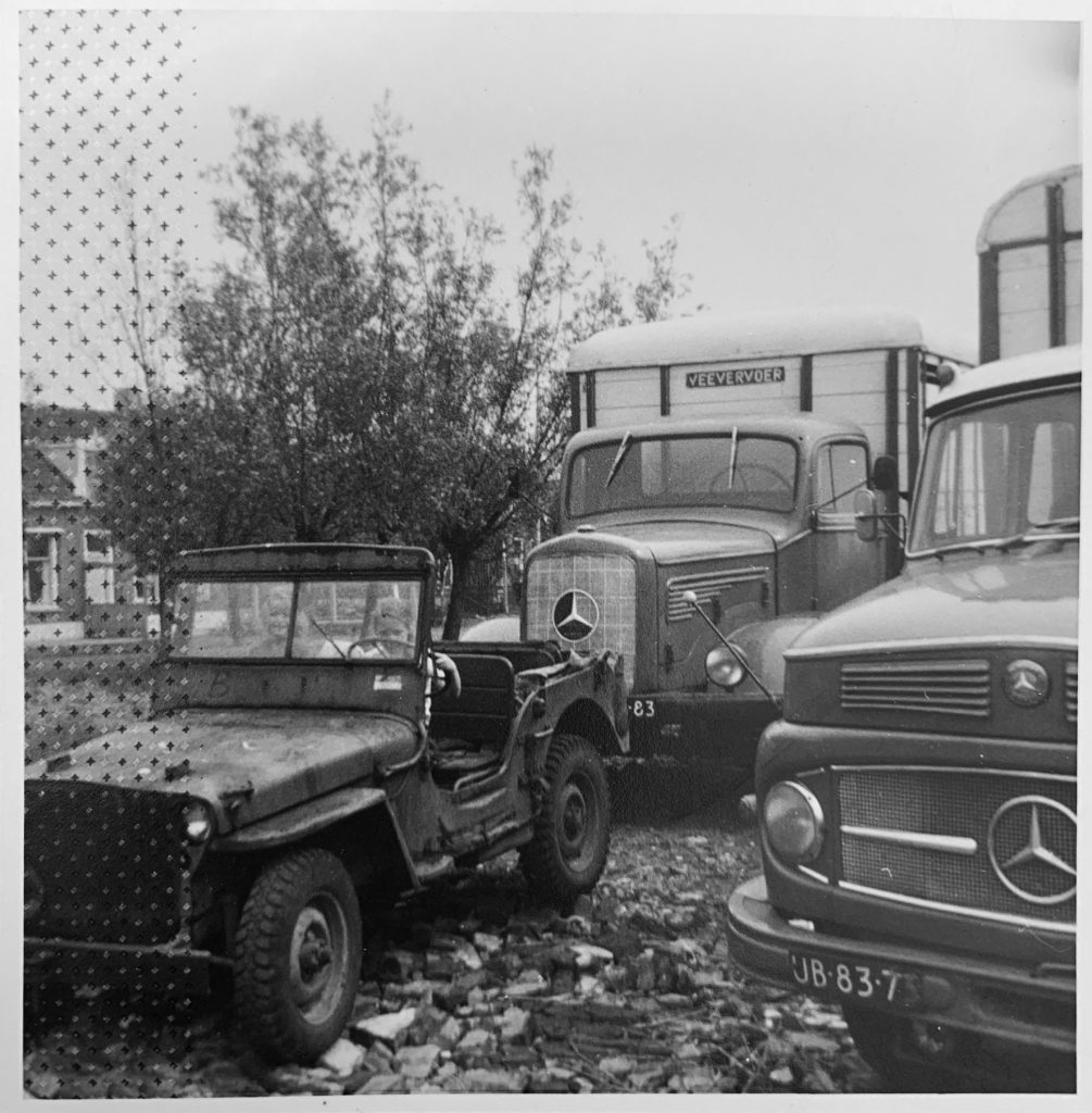 Met een oude leger Jeep, zoals op de foto, reed hij de aanhangwagens de werf op over het kleine bruggetje. Ieder van ons heeft op jonge leeftijd al leren rijden in deze oude Jeep, wij deden dit dan op de oude spoorlijn achter ons huis.