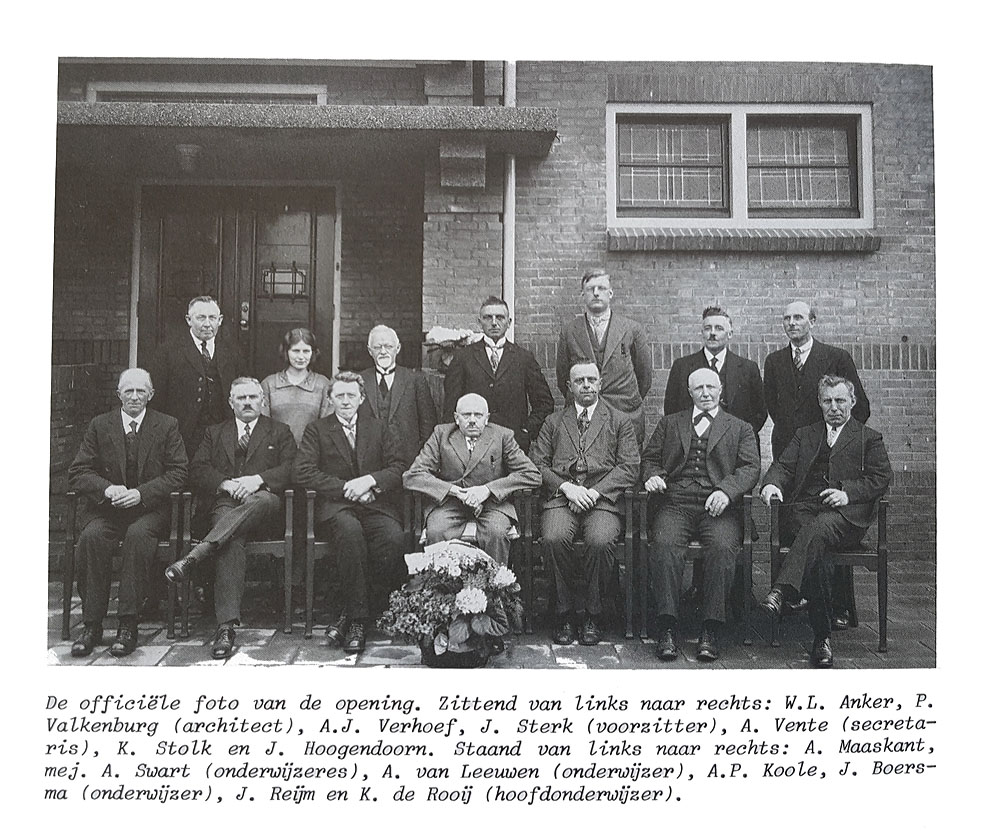 – De officiële foto van de opening. Staand van links naar rechts: A. Maaskant, mej. A. Swart (onderwijzeres), A. van Leeuwen (onderwijzer), A.P. Koole, J. Boersma (onderwijzer), J. Reijm en K. de Rooij (hoofdonderwijzer). Zittend van links naar rechts: W.L. Anker. P. Valkenburg (architect), A.J. Verhoef, J. Sterk (voorzitter), A. Vente (secretaris), K. Stolk en J. Hoogendoorn. –