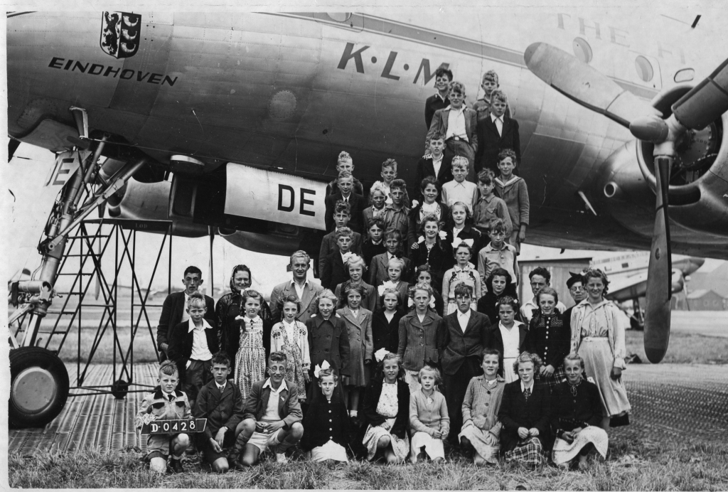 – De 4e en 5e klas naar Schiphol rond 1949/1950. We gaan bovenaf (de vliegtuigtrap) naar beneden, waarbij ik de namen van de bovenste vijf jongens direct al niet weet. Daaronder de eerste rij van links naar rechts: Jan in ’t Hout (boven), Maarten Molenaar (onder), Piet van Pelt (boven), Adriaan Vis (onder),onbekend, Willy Docters van Leeuwen, Jan van Vliet, Arie Groenendijk en een onbekende. De tweede rij van links naar rechts: den Outer (boven), ? Molenaar (onder), Jan Terlouw, Floor in ’t Hout, Sidi Doornhein, Ina Markus en Janus Stam. De derde rij van links naar rechts: Kees van Gelderen, juffrouw Sterk, meester Sierink, Joke den Outer, Hennie Vis, Annie Dul, Magda Hazenbroek (met witte strikken), Tini de Jong, meester Weeda en juffrouw Slobbe. De vierde rij van links naar rechts: Willem de Uijl, Elly Toech, Corry Terlouw, Dicky Baas, Elly Marelis, Riet Oosterom, Sjaan Vink, Wim van Gelderen, Truus de Jong, onbekend en nog een onbekende. Tenslotte de onderste rij van links naar rechts: Kees de Graaff, onbekend, onbekend, onbekend, onbekend, Trix Vis, Jannie de Uijl, onbekend en onbekend. –