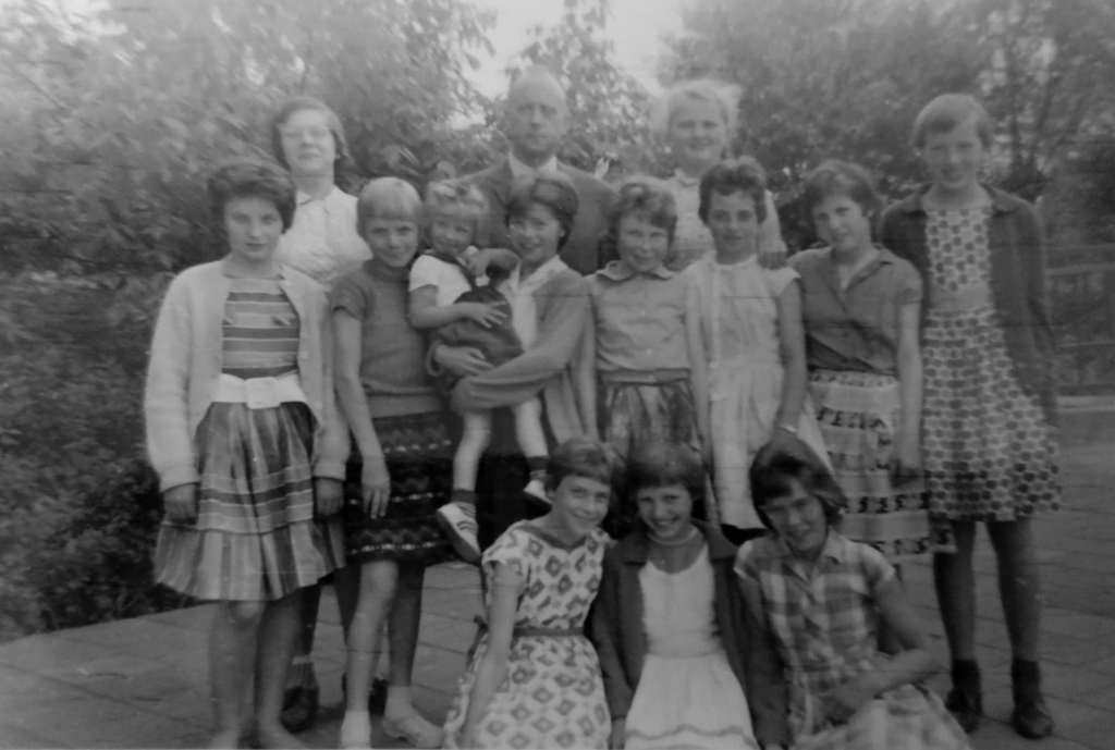 – Meisjes van boven naar beneden en v links naar rechts: Lenie Boudewijn, meester Fredrikze, Dineke Berkhout. 2e rij v Boven: Corrie Heuvelman, Ria vd Heuvel. Dochtertje? met Lia v. Erkel, Corrie Verkaik, Janneke Hoogendijk, Dieuwertje v Dam, Ria Rietveld, onderste rij: Ria Vrijenhoek, Cocky van Erkel,Tineke v. Vliet –