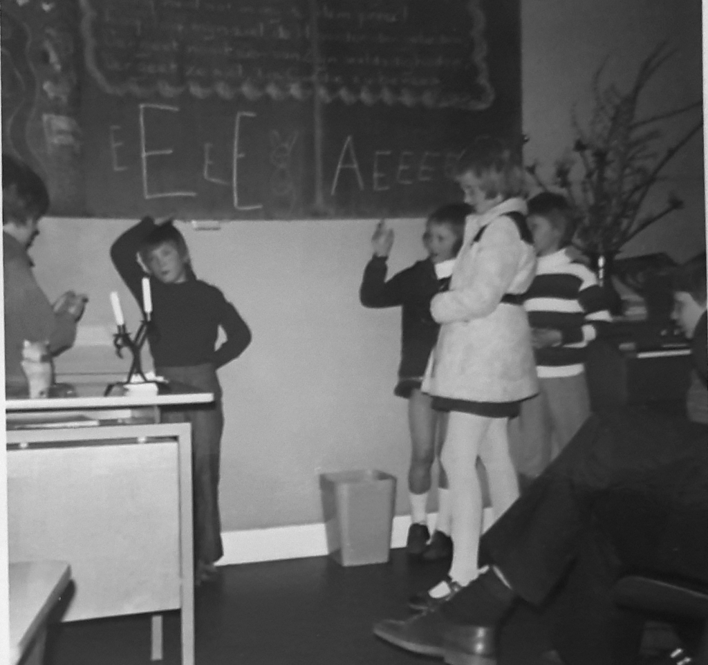 Door dat portiek gingen we naar binnen. Er stond altijd een leerling uit de 5e of 6e klas als deurwacht. Aan de voorkant zat ook een portiek, maar die was niet voor de leerlingen of de klassen 5 en 6 gingen daardoor naar binnen, dat weet ik niet meer. We moesten allemaal muisstil zijn, klas 1 t/m 6, 2 aan 2 in een rij langs de gevel staan. Eerst klassen 2 en 3, juffrouw Sterk, die zaten in het ‘nieuwere’ lokaal rechts, dan klas 1, wij dus, het eerste lokaal links bij juffrouw Peek. Daarna de leerlingen van klas 4, meester Menno vd Hoek, lieve man was dat. Als laatste klas 5 en 6 helemaal aan het eind van de gang bij meester Fredrikze.